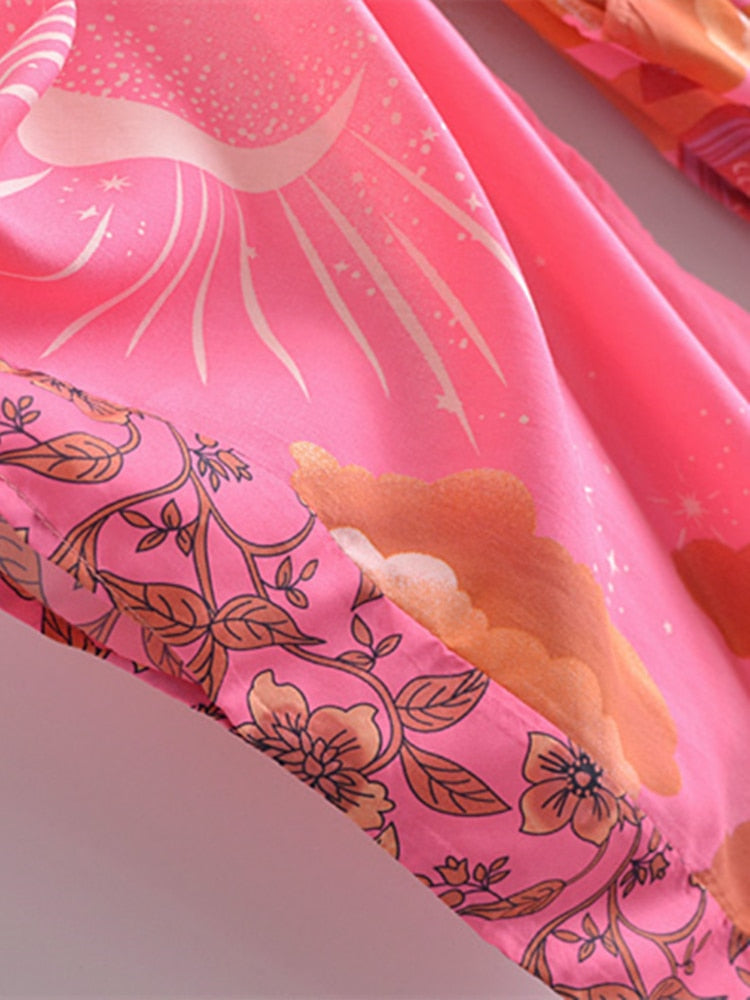 This charming piece combines the best of bohemian and asian styles for a truly enchanting look. With a flattering V-neckline, flowy batwing sleeves, and delicate sashes, it's a perfect blend of comfort and elegance. The whimsical star and moon floral print adds a touch of magic to your outfit.