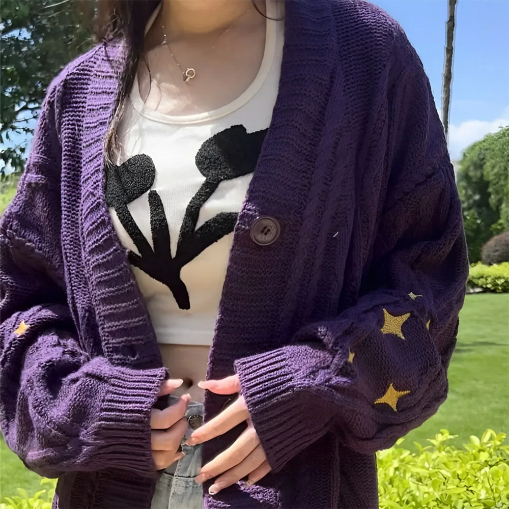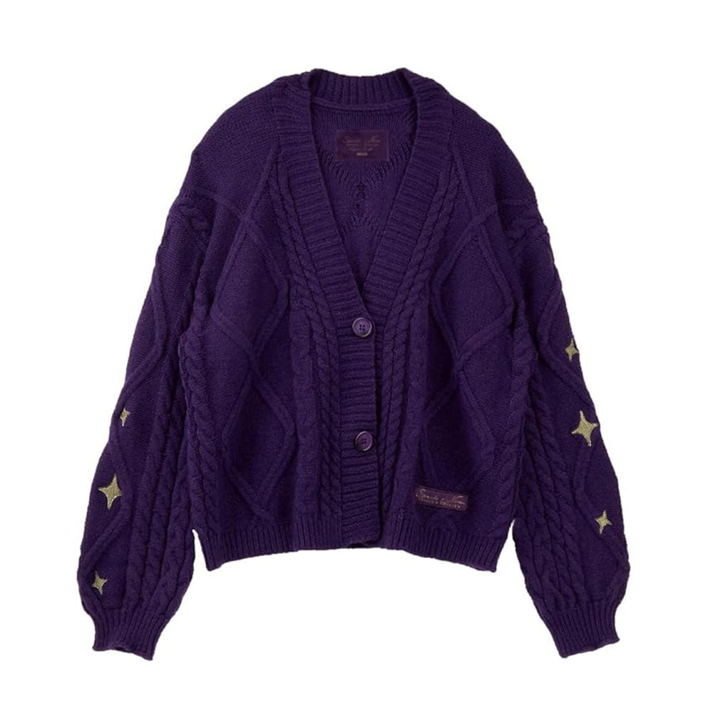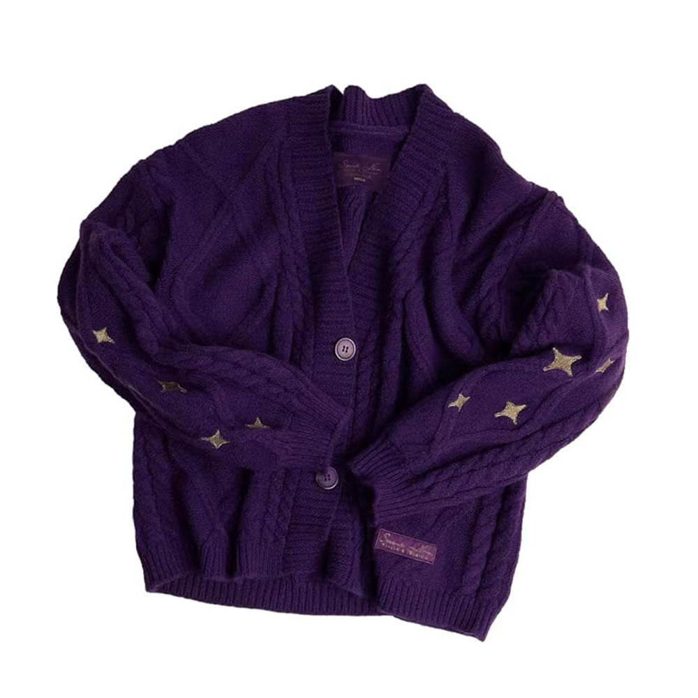 This button-up cardigan boasts intricate embroidered stars on the sleeves, adding a touch of magic to your wardrobe. The rich purple hue exudes elegance and complements the cosmic theme. Crafted for comfort and style, this sweater brings together cozy chic and celestial allure.