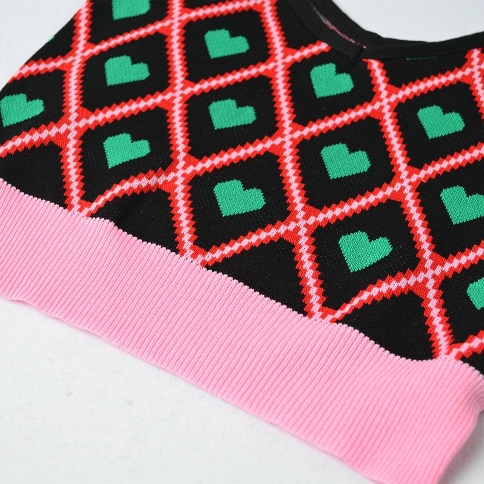 This playful piece features neon green hearts, adding a pop of color and fun to your look. Crafted from cozy knit fabric and designed in a stylish crop length.